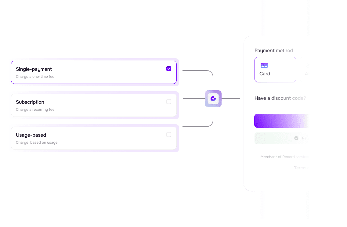 Usage-based, subscription-based (with add-ons), and one-time payments come built in